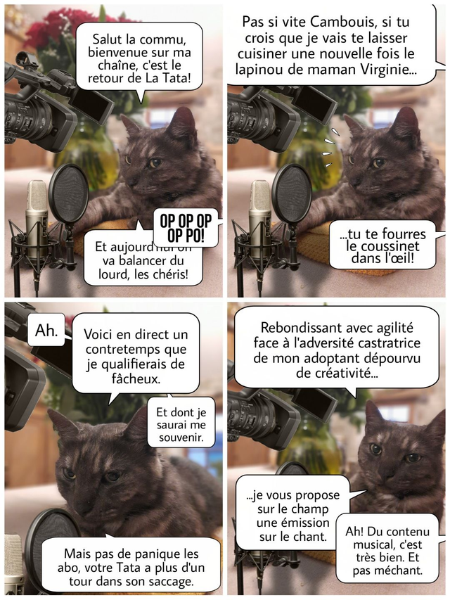 Trop c’est trop : la Nature n’en peut plus ! Cambouis, la psychochatte vosgienne zigouilleuse en série, a dépassé les bornes. Entre ses tutos « Cuisine en Cauchemar » dont le secret de réussite est « le meilleur ingrédient est celui qu’on a connu vivant », sa façon si personnelle de rendre le monde émotionnellement meilleur à grands coups de pelle, et son cynisme à toute épreuve, les créatures encore vivantes qui l’entourent sont à bout. Ses amis sauront-ils la ramener vers la voie du vivre ensemble et sans assaisonnement ?